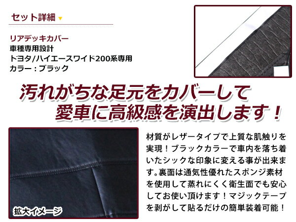 気になる足元の汚れに! 靴などの汚れから愛車をカバーします【適合車種】・メーカー:トヨタ・車種:ハイエース・型式:200系 1型 2型 3型 4型 ワイド車・カラー:ブラック 黒・商品タイプ:リア用【商品説明】【商品説明】PVCレザー デッキカバー 足元カバー汚れがちな足元をカバーしながら、レザータイプの上質な肌触りで高級感を演出します。