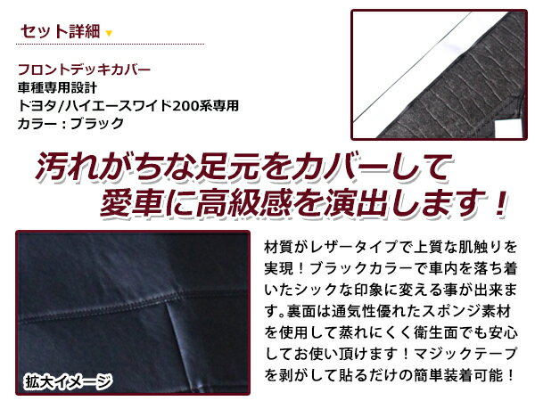 気になる足元の汚れに! 靴などの汚れから愛車をカバーします【適合車種】・メーカー:トヨタ・車種:ハイエース・型式:200系 1型 2型 3型 4型 ワイド車・カラー:ブラック 黒・商品タイプ:フロント用【商品説明】【商品説明】PVCレザー デッキカバー 足元カバー汚れがちな足元をカバーしながら、レザータイプの上質な肌触りで高級感を演出します。